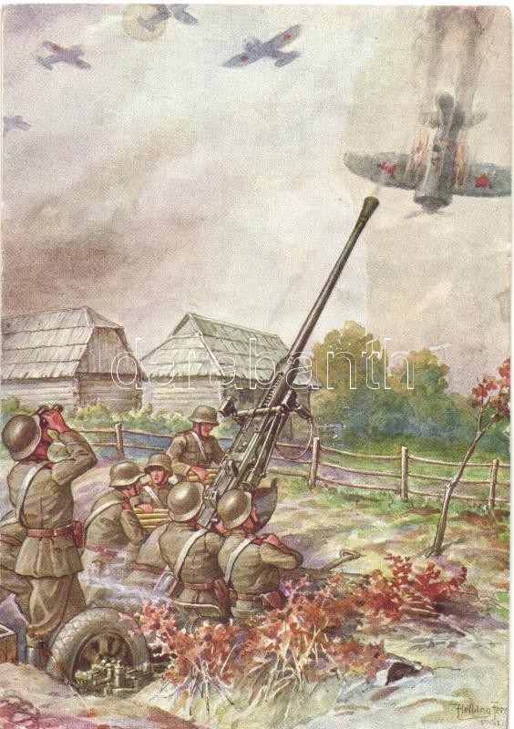 Marton Ferenc szakaszvezető gépágyújára támadó öt ellenséges repülőgéppel is szembeszállva egyet lelőtt, a többit pedig menekülésre késztette / WWII Hungarian Military Officer Ferenc Marton fighting aeroplanes with anti-aircraft gun s: Helbing Ferenc + 1943 Haditudósító kiállítás a pesti Vigadóban So. Stpl. (szakadás / tear)