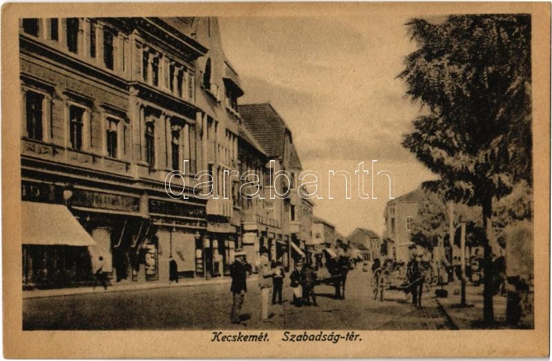 Kecskemét, Szabadság tér, üzletek. Kiadja Manó János https://www.darabanth.com/hu/355-Gyorsarveres/355.0/Kepeslapok/Magyarorszag~1000005/Kecskemet-Szabadsag-ter-uzletek-Kiadja-Mano-Janos~II2025082