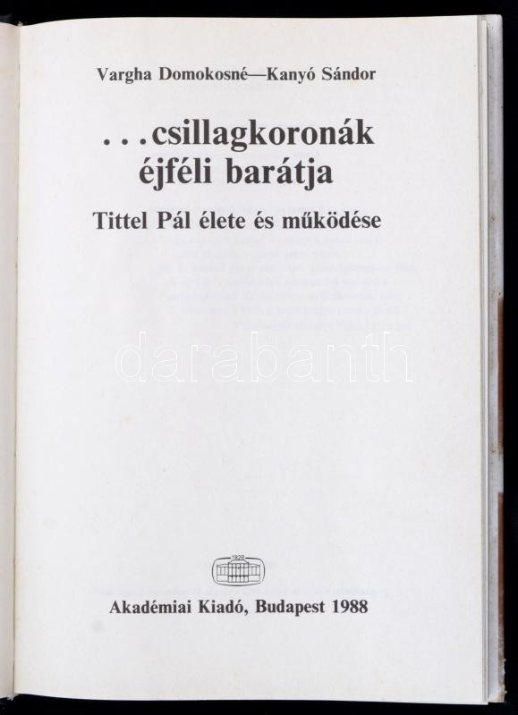 Leírás: Vargha Domokosné-Kanyó Sándor: ... csillagkoronák éjféli barátja. Tittel Pál élete és működése. Bp.,1988, Akadémiai Kiadói. Kiadói egészvászon-kötés, kiadói papír védőborítóban.