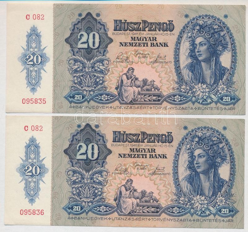 1941. 20P (2x) sorszámkövetők T:I-,II https://www.darabanth.com/hu/355-Gyorsarveres/355.0/Numizmatika/Magyar-bankjegyek~2500007/1941-20P-2x-sorszamkovetok-TI-II~II2029879