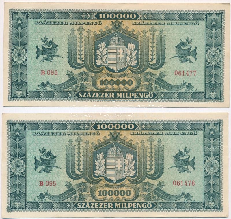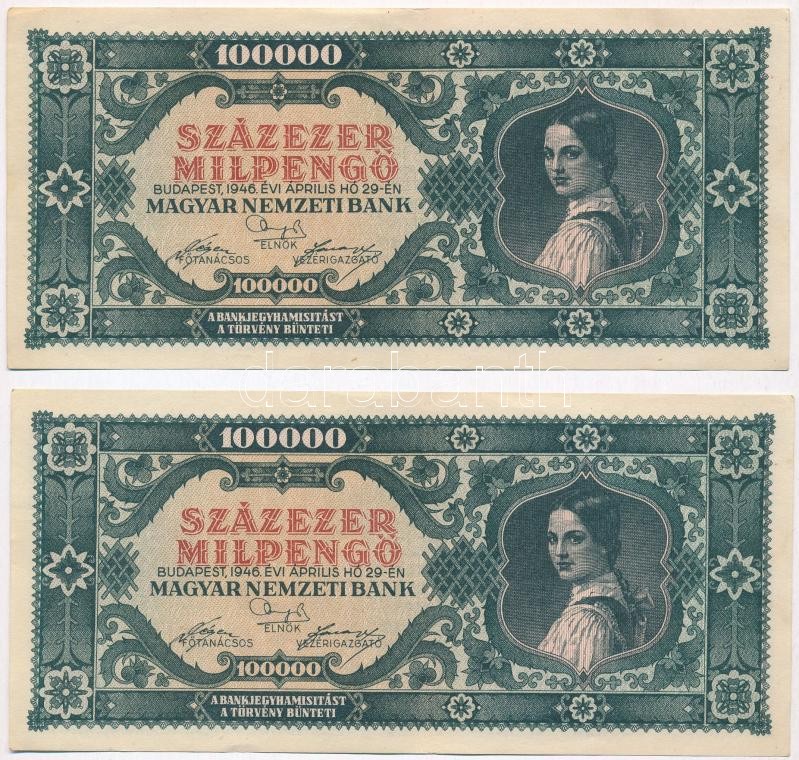 1946. 100.000MP (2x) sorszámkövetők T:II https://www.darabanth.com/hu/355-Gyorsarveres/355.0/Numizmatika/Magyar-bankjegyek~2500007/1946-100000MP-2x-sorszamkovetok-TII~II1963685