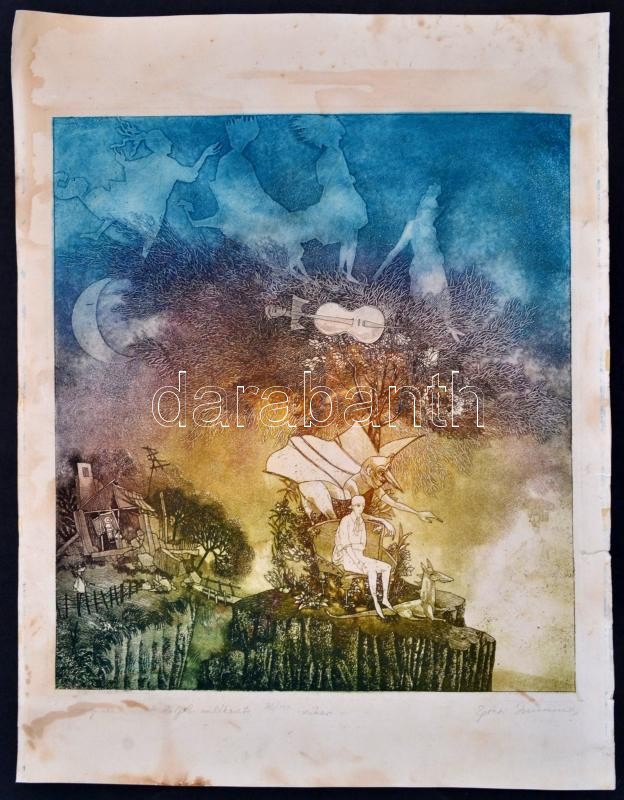 Leírás: Egresi Zsuzsa (1954-): Régi dolgok emlékezete. Színezett rézkarc (45/100), papír, jelzett, szélén szakadás, folttal, 32×29 cm