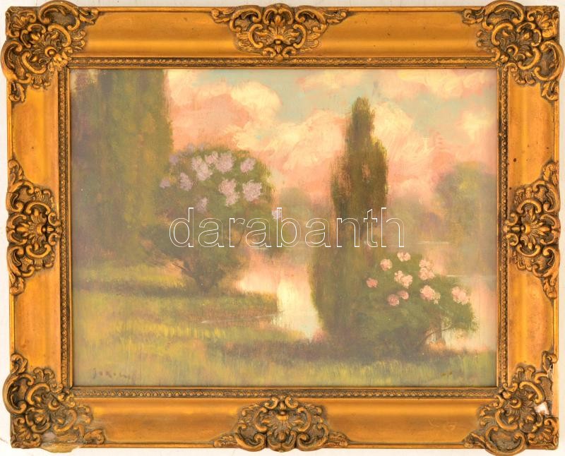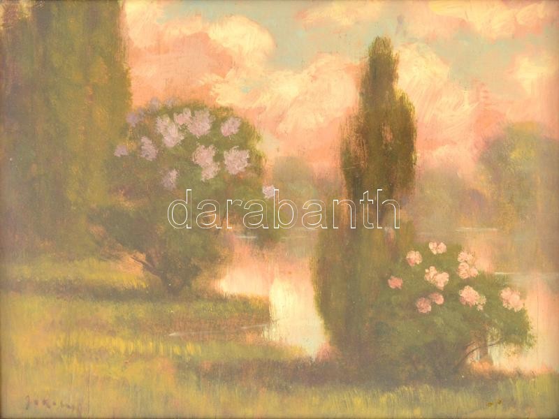 Leírás: Jakab Károly (1904-1994): Tó part. Olaj, falemez, jelzett, üvegezett keretben, 17,5×23,5 cm