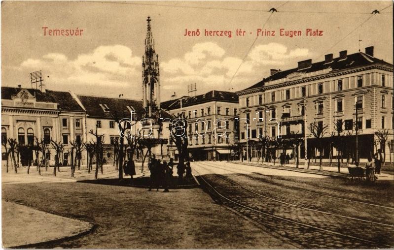 1912 Temesvár, Timisoara; Jenő herceg tér, Rukavina emlékmű, Takarékpénztár, villamossín. Kiadja a "Koronaherczeg" tőzsde / square, monument, savings bank, tramway