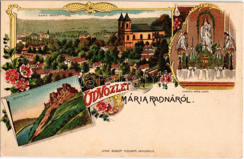 Leírás: Máriaradna, Radna; Lourdesi Mária szobor, Solymos vára / Soimos castle, statue. Gregor Fischer No. 647. Art Nouveau, floral, litho