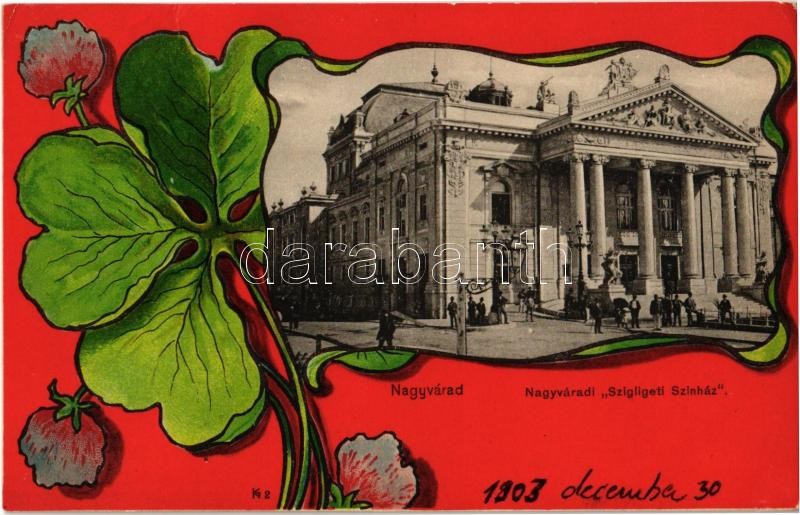 Leírás: Nagyvárad, Oradea; Szigligeti Színház. Kiadja Sonnenfeld A. szecessziós litho keret lóherével / Theatre. Art Nouveau, clover litho frame (EK)