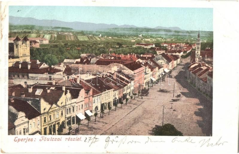Leírás: 1900 Eperjes, Presov; Fő utca, üzletek. Kiadja Cattarino Sándor / main street, shops (apró szakadás / tiny tear)