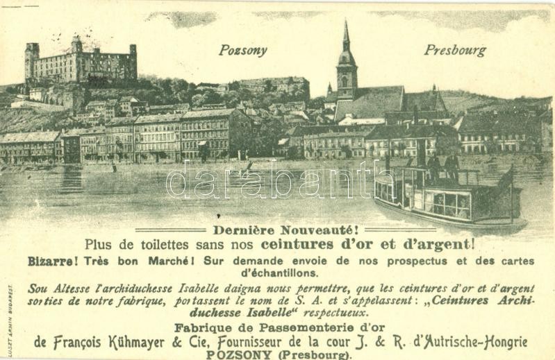1900 Pozsony, Pressburg, Bratislava; Vár, gőzhajó. Luszt Ármin kiadása... https://www.darabanth.com/hu/356-Gyorsarveres/356.0/Kepeslapok/Felvidek~1500007/1900-Pozsony-Pressburg-Bratislava-Var-gozhajo-Luszt-Armin-kiadasa-Francois-Kuhmayer-rekl~II1686713
