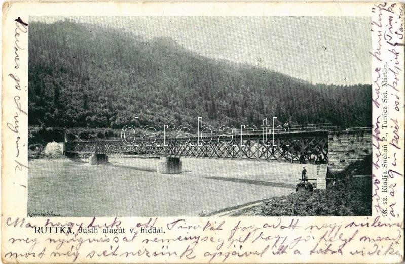 Leírás: 1901 Ruttka, Vrútky; Justh alagút a vasúti híddal. Kiadja Sochán P. 93. / railway tunnel, railway bridge (EK)