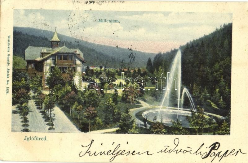 1907 Iglófüred, Bad Zipser Neudorf, Spisská Nová Ves Kupele, Novovesské Kúpele; Millenium park és a szálloda, szökőkút. Kiadja Wlaszlovits Gusztáv No. 1538. / park, hotel, fountain (EK)