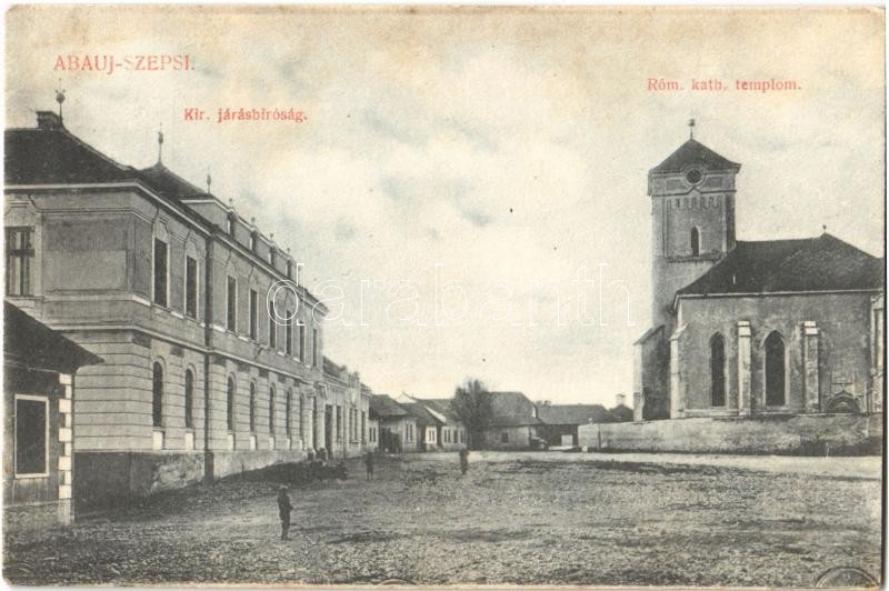 1910 Szepsi, Abaújszepsi, Moldava nad Bodvou; Kir. Járásbíróság, Római katolikus templom. Kiadja Davidovics Emil / district court, Catholic church (fl)