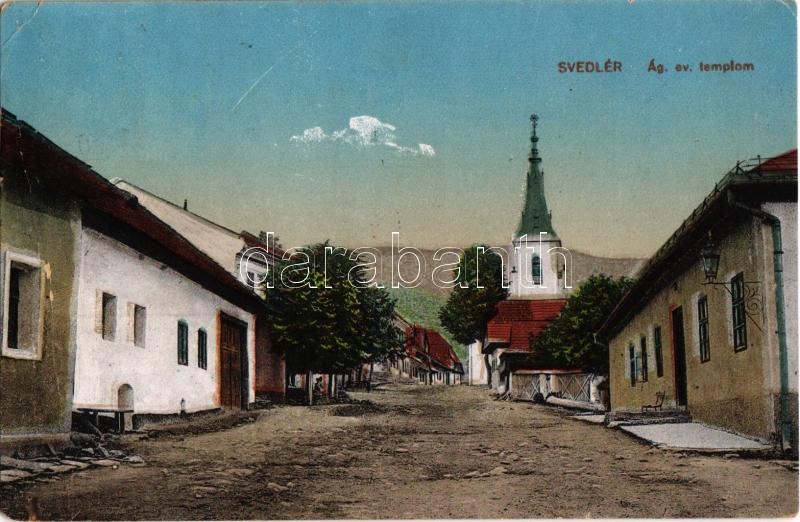 Leírás: 1928 Svedlér, Svedlár; Ágostai evangélikus templom, utca / street, church (EK)