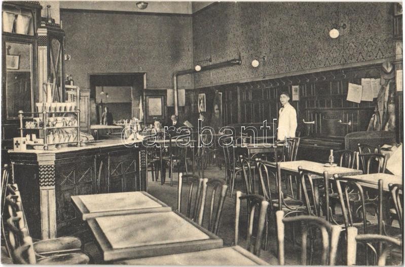 Leírás: Érsekújvár, Nové Zámky; Porjesz Samu "Otthon" kávéháza, belső pincérrel és vendégekkel / Kaviáren / café interior, waiter and guests
