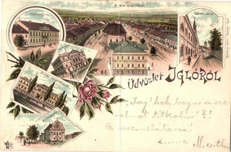 Igló, Zipser Neudorf, Spisská Nová Ves; Város felső része, Főgimnázium, Állami tanítóképezde, Evangélikus templom, Városház, Lőcsei utca. Csetényi Emil kiadása / grammar school, teachers traning institute, church, town hall, street. floral, litho (fa)