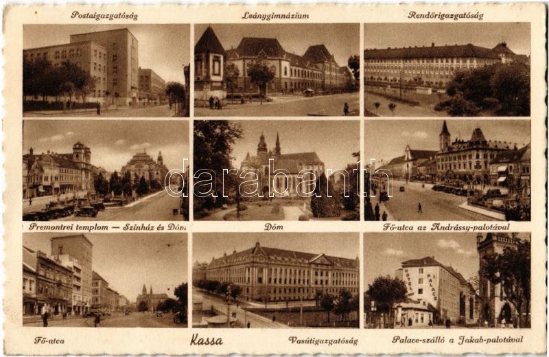 Kassa, Kosice; Postaigazgatóság, Leány gimnázium, Rendőrigazgatóság, Premontrei templom, Színház és Dóm, Fő utca az Andrássy palotával, Vasútigazgatóság, Palace szálló a Jakab palotával / post directorate, girls' high school, police directorate, church, theatre, cathedral, main street, palace, railway directorate, hotel (gyűrődés / crease)