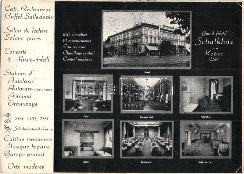 Leírás: Kassa, Kosice; Schalkház reklámlap, belső, koncert terem, étterem, kávézó, bor terem / Hotel interior with advertisement + "1938 Kassa visszatért" So. Stpl (EK)
