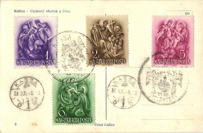 Leírás: Kassa, Kosice; Vlajkovy obelisk a Dóm / székesegyház, obeliszk, emlékmű. Kiadja Fried / cathedral, flag obelisk, monument + 1938 Kassa visszatért So. Stpl. (EK)