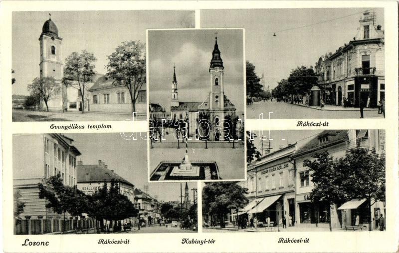 Losonc, Lucenec; Evangélikus templom, Rákóczi út, Kubinyi tér, Magyar Király Szálloda, országzászló. Filó Marcel kiadása / churches, street, square, hotel, Hungarian flag