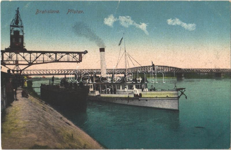 Leírás: Pozsony, Pressburg, Bratislava; Prístav / kikötő, gőzhajó, portáldaru / port, steamship, dockside crane