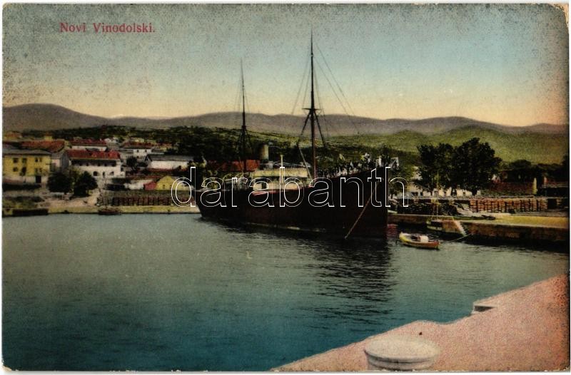1918 Novi Vinodolski, Novi, Novoga; kikötő gőzhajóval. M. Baran 826. Wilhelm Berger Fotograf / port with steamship, steamer (kopott sarok / worn corner)