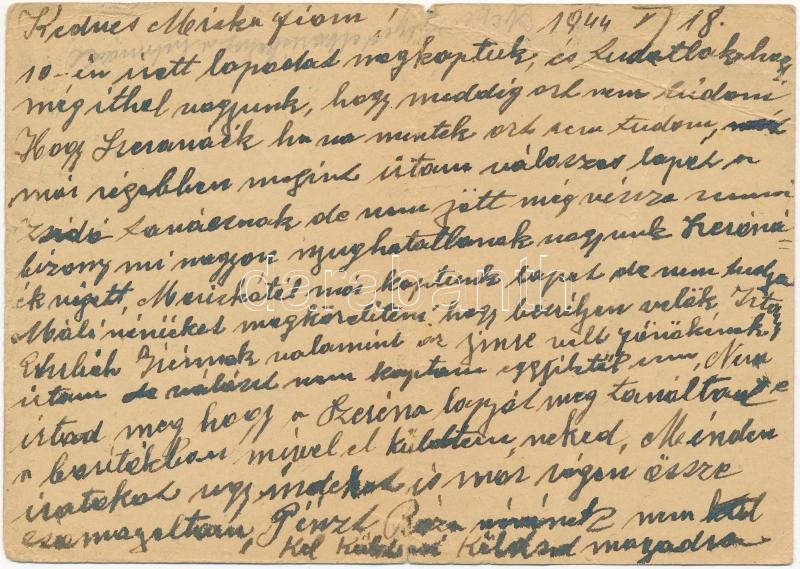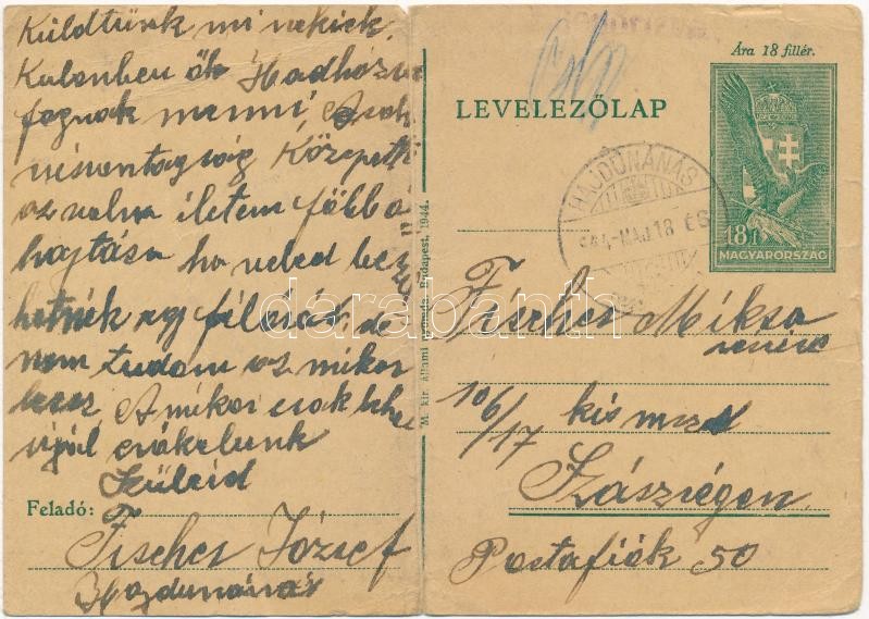 1944 Fischer József levele fiának Fischer Miksa zsidó 106/17-es KMSZ-nek (közérdekű munkaszolgálatos) a szászrégeni munkatáborba / WWII Letter to a Jewish labor serviceman from his father to the labor camp of Reghin. Judaica (fa)
