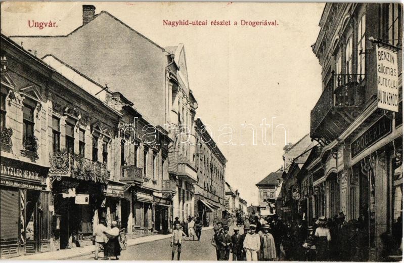 Leírás: 1913 Ungvár, Uzshorod, Uzhorod; Nagyhíd utca, Goldstein Miksa, Güntzler Henrik üzlete, drogéria (gyógyszertár), utcai benzintöltő állomás. Kiadja Steinfeld Dezső / street view, shops, pharmacy, gas filling station, petrol pump (r)