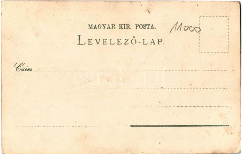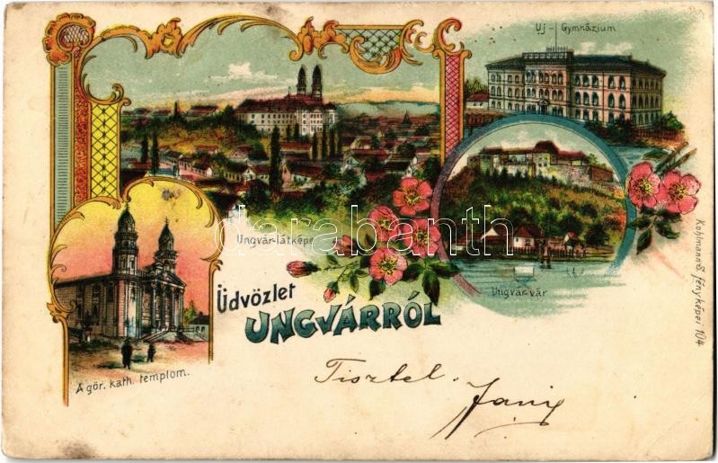 Ungvár, Uzshorod, Uzhhorod, Uzhorod; látkép, Görögkatolikus templom, Új gimnázium, vár. Kohlmann S. fényképei 104. / general view, Greek Catholic church, high school, castle. Art Nouveau, floral, litho (EK)