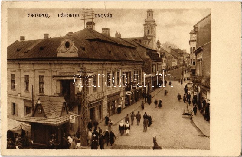Leírás: Ungvár, Uzshorod, Uzhorod; utca, templom, üzletek, kioszk, piac / street, shops, kiosk, church, market