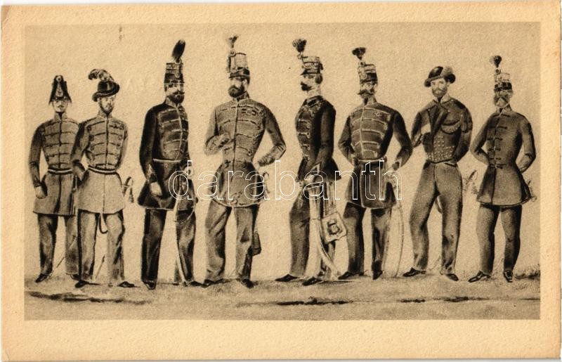 Magyar Hadseregképek. Törzstisztek. Balról jobbra: árkász, vadász, tüzér, tábornok, huszár, honvéd, hunyadi lovas, nemzetőr. Komlós "Negyvennyolc" Sorozat I. 10. / Hungarian military uniforms, left to right: sapper, hunter, artilleryman, general, hussar, honvéd, cavalryman, national guard. Hungarian Revolution of 1848 (EK)