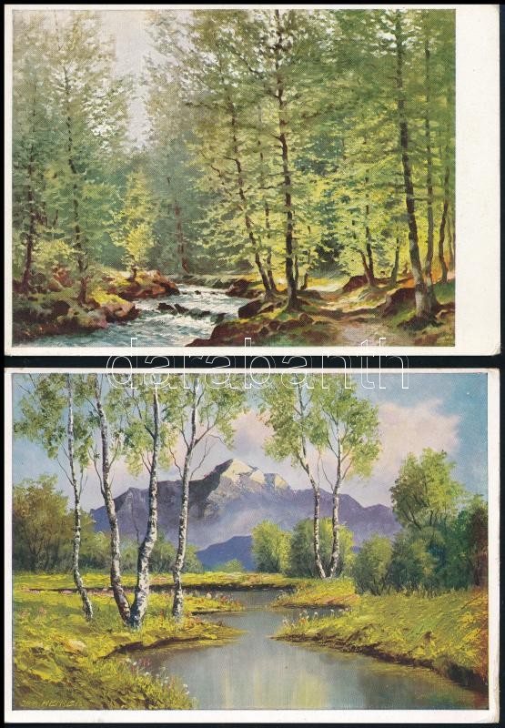 Leírás: 9 db RÉGI használatlan külföldi művészlapok: tájfestmények / 9 pre-1945 European postcards, landscape paintings