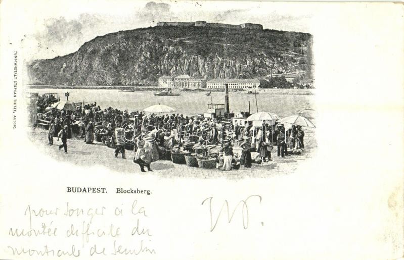 Leírás: 1899 Budapest XI. Gellérthegy, piaci árusok, gőzhajó, rakpart. Kunstanstalt Stephan Tietze (EK)