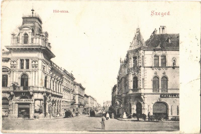 1907 Szeged, Híd utca, Katai, Gonda János üzlete (gyűrődés / crease) https://www.darabanth.com/hu/356-Gyorsarveres/356.0/Kepeslapok/Magyarorszag~1500005/1907-Szeged-Hid-utca-Katai-Gonda-Janos-uzlete-gyurodes-crease~II2041941