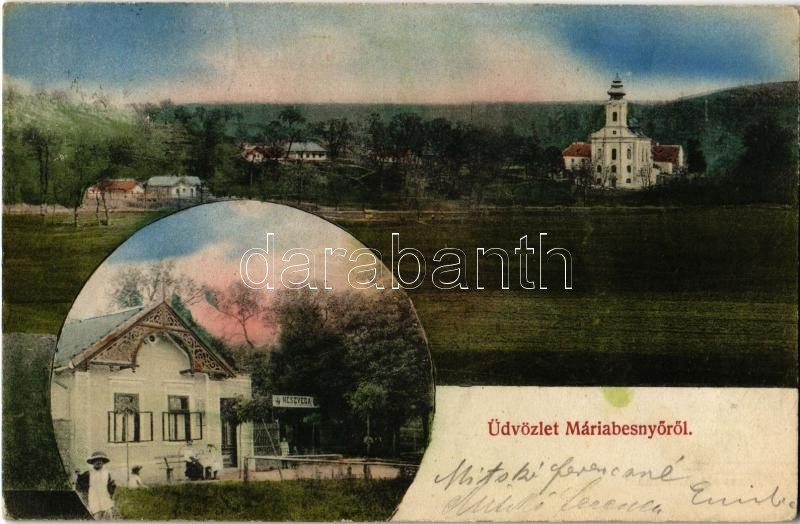 Leírás: 1912 Máriabesnyő (Gödöllő), Kegytemplom, Neszveda vendéglője a "Méhkashoz", étterem. Neszveda A. saját kiadása
