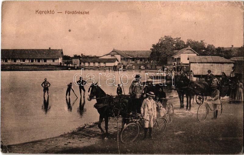 Leírás: 1916 Gyopárosfürdő, Gyopáros (Orosháza); Kerektó, fürdő részlet, fiúk kerékpárral, lovaskocsik a tó partján. H. M. T. 20. (EK)