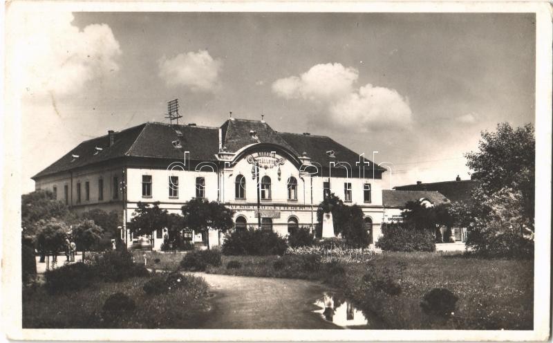 Leírás: 1939 Abony, Kossuth szálloda, vendéglő, étterem, Gyógyszertár, üzletek, Abonyi Lajos mellszobra. Járdányi Gyula felvétele (apró sarokhiány / tiny corner shortage)