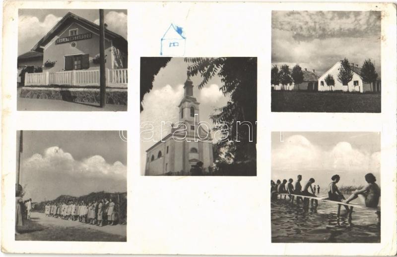 1941 Balatonszárszó, Vasútállomás, Református templom, zászlófelvonás, SDG (Soli Deo Gloria) üdülő, SDG strand, fürdőzők. Soli Deo Gloria diákszövetség kiadása. Naszádi Béla felvétele (EK)