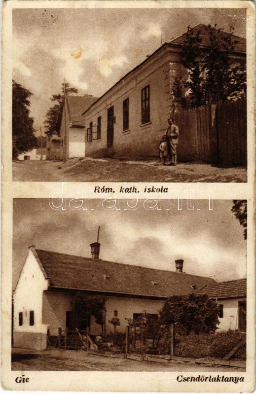 Leírás: 1942 Gic, Római katolikus iskola, Csendőrlaktanya. Kiadja a Hangya Szövetkezet (EK)