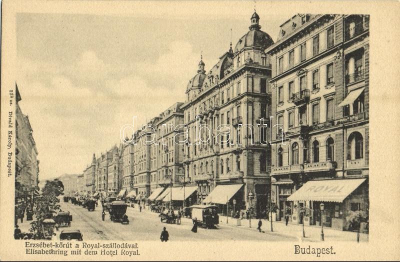 Leírás: Budapest VII. Erzsébet körút, Hotel Royal szálloda és kávéház, villamos, üzletek. Divald Károly 238. sz.