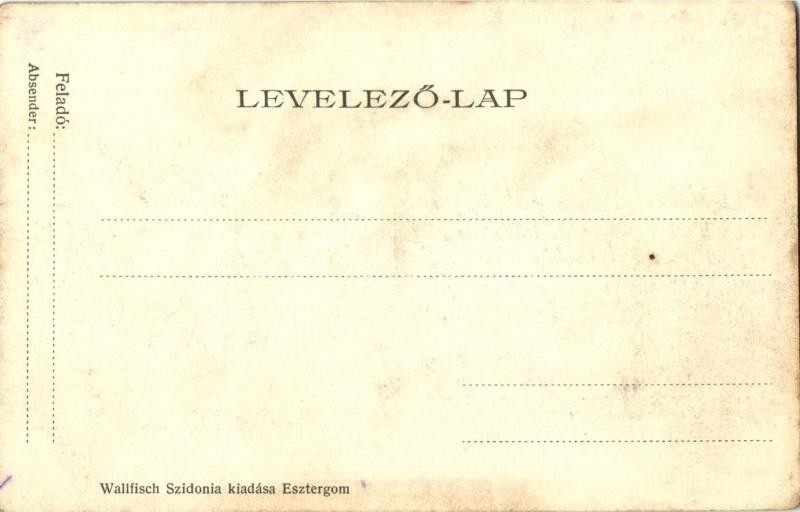 Leírás: Esztergom, Vártemplom, prímási palota és hajóállomás, Bazilika, "Budapest" személyszállító gőzös. Kiadja Wallfisch Szidonia (fl)