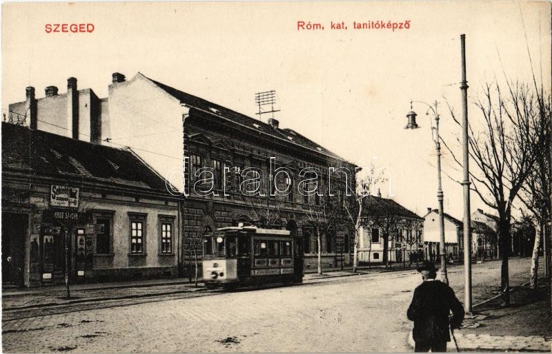 Leírás: Szeged, Római katolikus tanítóépző, üzlet, Schicht szappan reklámja, villamos. Kiadja Alth Lajos