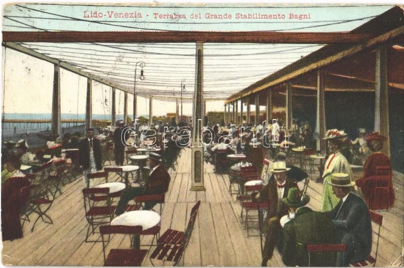 Leírás: Venezia, Venice; Lido, Terrazza del Grande Stabilimento Bagni / restaurant terrace at the beach. Edit. Fratelli Garbisa (Rb)