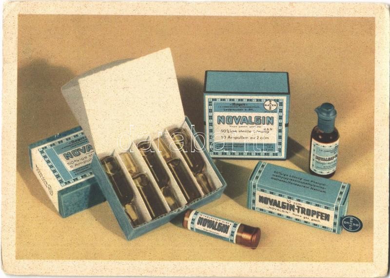 Leírás: Bei Schmerzen: Novalgin. Per os, intramuskulär, intravenös. Bayer I. G. Farbenindustrie-Aktiengesellschaft / German painkiller advertisement card (EK)