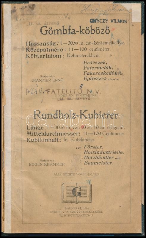 Leírás: Gömbfa-köböző. Rundholz-Kubierer. Szerk.: Krammer Ernő. Bp.,1938, Gergely R. Félvászon-kötés, a címlap és egy lap javított, az elülső szennylap kijár.