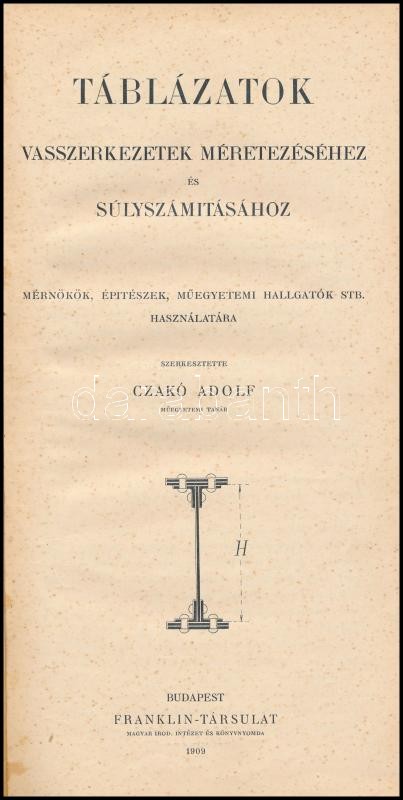 Leírás: Táblázatok vasszerkezetek méretezéséhez és súlyszámításához. Mérnökök, építészek, műegyetemi hallgatók használatára. Szerk.: Czakó Adolf. Bp.,1909, Franklin. Kiadói félvászon-kötés, kissé kopott borítóval.