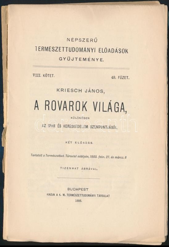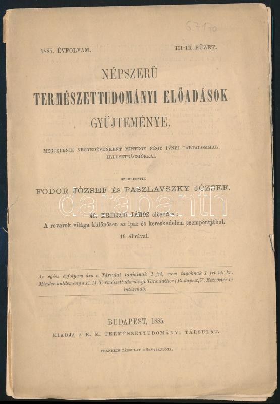 Leírás: Fodor József, Paszlavszky József (szerk.): Népszerű természettudományi előadások gyűjteménye. 3. füzet. 1885-ik évfolyam. 1885, Természettudományi Társulat. Papírborítóval .
