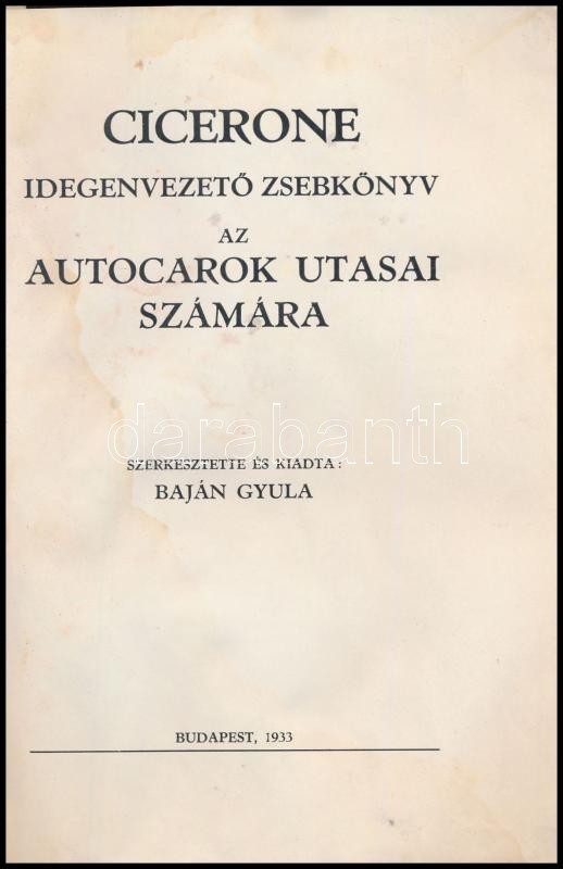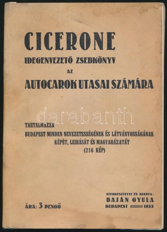 Cicerone. Idegenvezető zsebkönyv az autocarok utasai számára. Tartalmazza Budapest minden nevezetességének és látványosságának képét, leírását és magyarázatát. Szerk. és kiadta: Baján Gyula. Bp., 1933, (Általános ny.). 191 p. Szövegközti fekete-fehér képekkel gazdagon illusztrált. Kiadói fűzött papírborítóban, foltos.