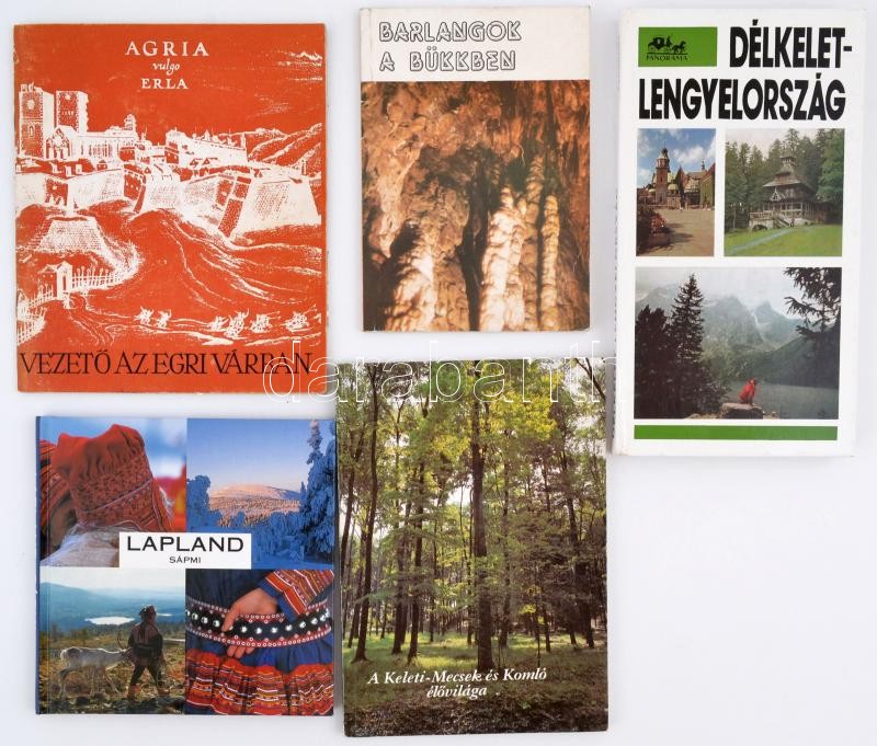 Vegyes útikönyv tétel, db: Lénárt László: Barlangok a Bükkben, Lapland Sápmi, Bács Gyula: Délkelet-Lengyelország, Fazekas Imre: A Keleti-Mecsek és Komló élővilága, Détshy Mihály: Vezető az Egri Várban. Különféle kiadásban. Kiadói kartonált papír- és kiadói papírkötésben, változó állapotban.