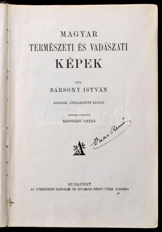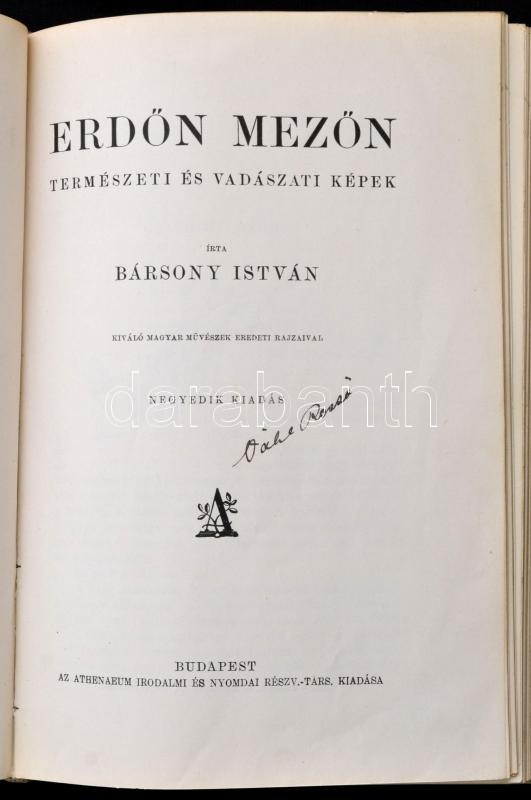 Bársony István 2 munkája (egybekötve): Magyar természeti és vadászati képek. Neogrády Antal képeivel; Hozzákötve: Erdőn-mezőn. Természeti és vadászati képek. Kiváló magyar művészek eredeti rajzaival. Negyedik kiadás. Bp.,[1926-1922],Athenaeum,218+2 p. 22 t. (lapszámozáson belül.) ; 276 p.+ 8 t. Átkötött aranyozott gerincű félvászon-kötés, kopott borítóval.