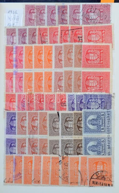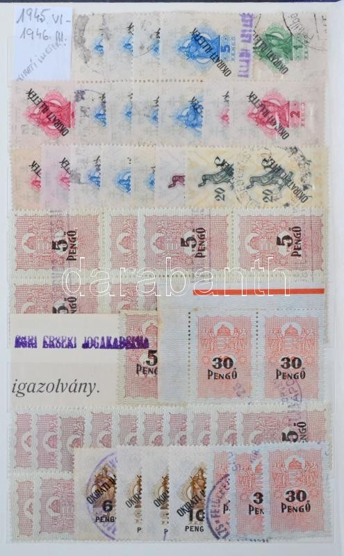 Leírás: 875 db magyar állami okirati illetékbélyeg a Pengő-fillér időszakból 10 lapos közepes berakóban