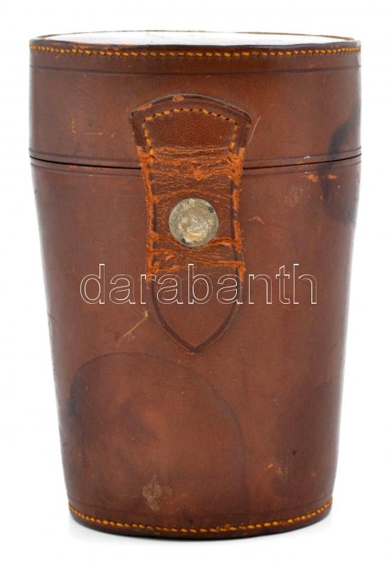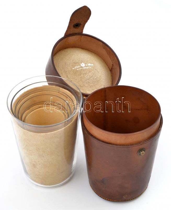 Leírás: Utazó pohár készlet (6 db), bőr tokban, jelzett (M.Würtz&Söhne) m:12 cm